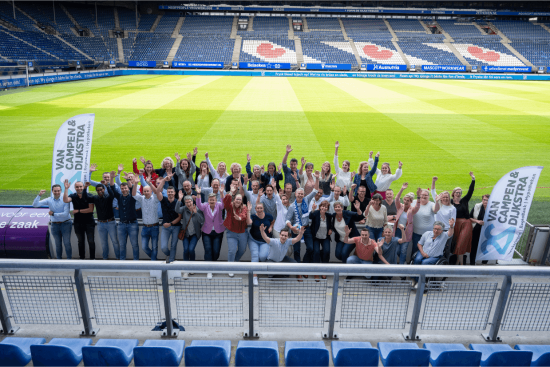 “Ieder jaar organiseren we voor de zomervakantie een halfjaarbijeenkomst om al onze medewerkers bij te praten over het reilen en zeilen van het bedrijf. Met inmiddels zo’n 70 medewerkers is het niet meer mogelijk dit op ons hoofdkantoor te doen. En omdat deze bijeenkomst samen viel met de bezegeling van het partnership, besloten we de avond in het Abe Lenstra stadion te houden.” vertelt Job. “En zo konden we ook direct een mooie groepsfoto laten maken waarop bijna alle collega’s staan.”